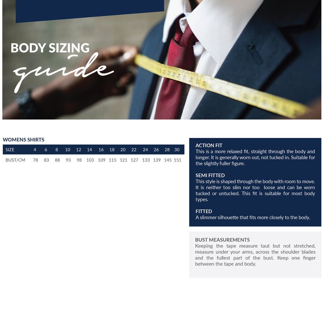 * Size charts should be used as a measuring guide only. Garments will vary according to style and fit of the garment.